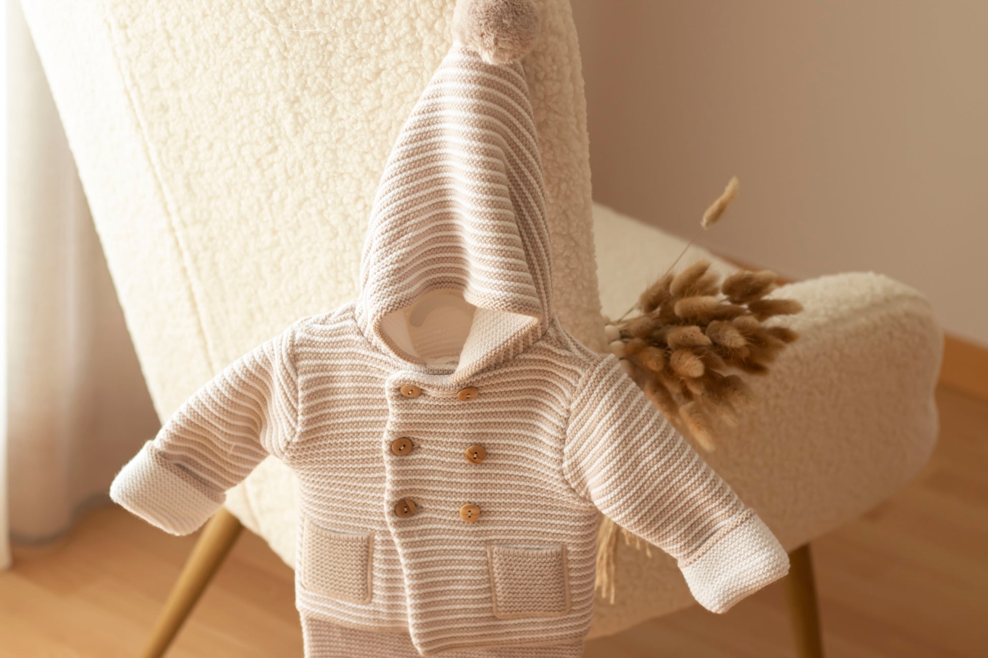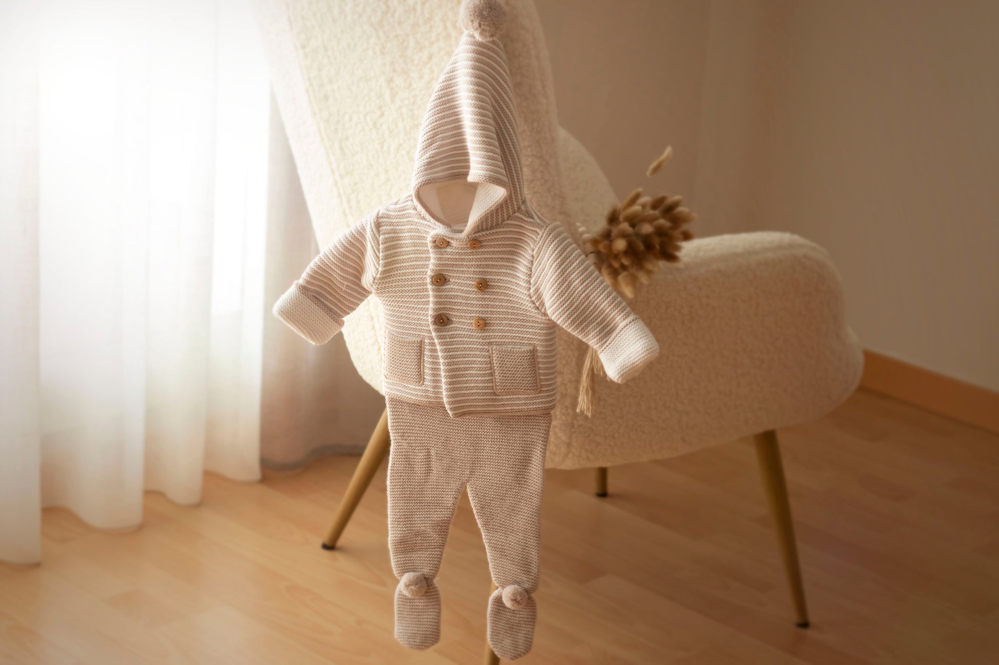 Conjunto compuesto de dos piezas, abrigo con capucha y cierre frontal con botones y polaina con pies cubiertos y cinturilla elástica para un ajuste cómodo.